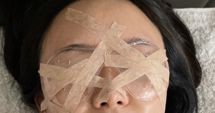 睡覺用的護目罩只需要貼外框就好,因為半夜可能會不舒服再次打開點藥水,所以上圖膠帶是錯誤示範~