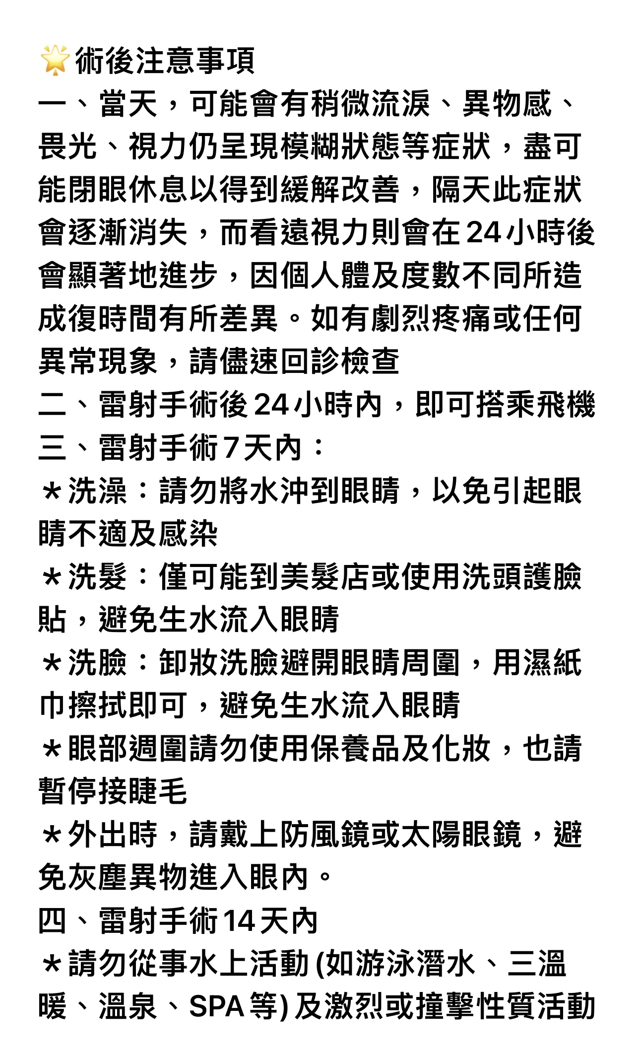 手術安排在晚上比較舒適,術後至少休息三天,我自己則是安排了兩週左右完整的恢復期,讓眼睛徹底休息、也確保工作品質不受影響。